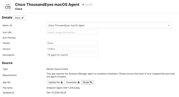 Given that we have an Apple MacMini on the Registration network, it was a simple decision to install the ThousandEyes macOS agent on it systematically using Meraki Systems Manager.