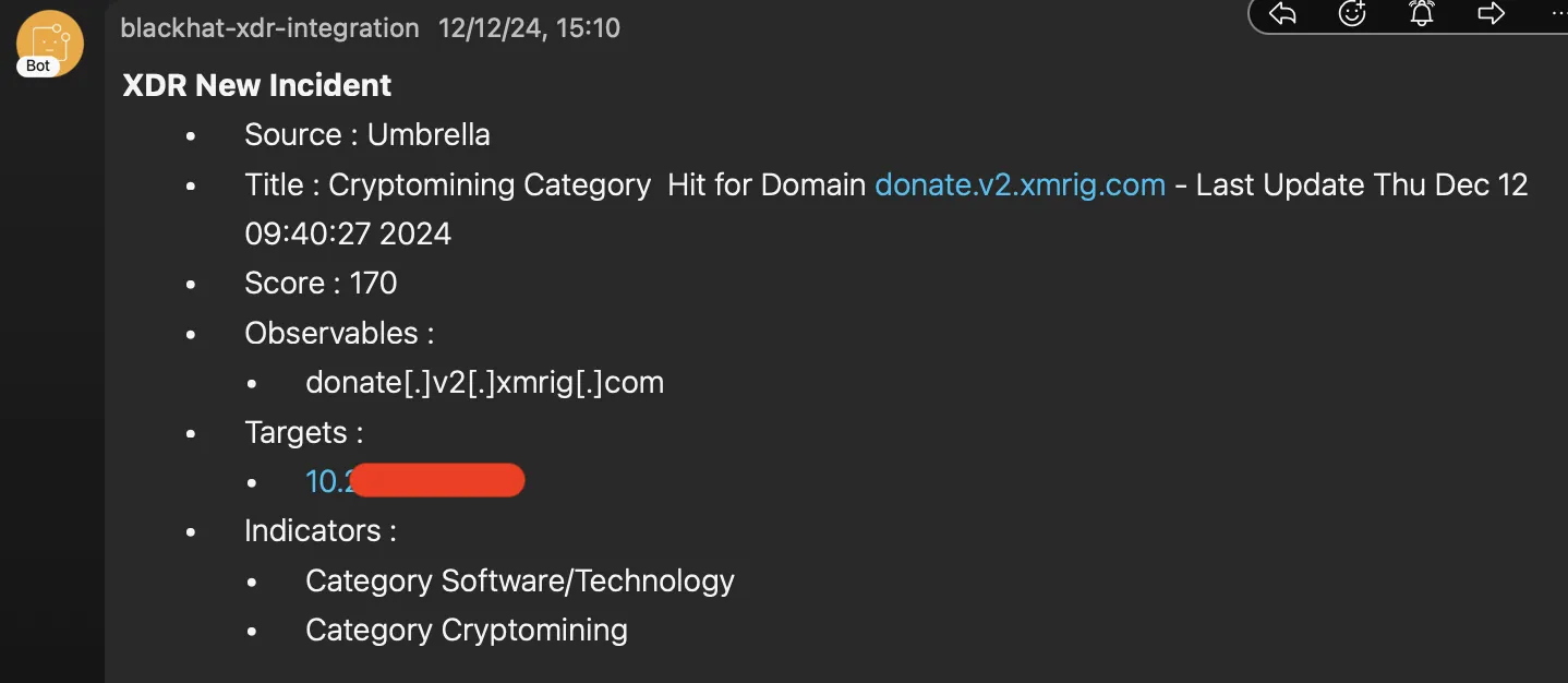 Remember from our past blogs, we used automation for incident notifications into Webex, as well as ‘’ in XDR for Umbrella category blocks. Both these workflows were spruced up and used extensively at Black Hat Europe 2024. We now see the last update timestamp right in the incident title itself and the Webex message, which greatly simplifies the understanding of a detection for our threat hunters.Creating an Incident