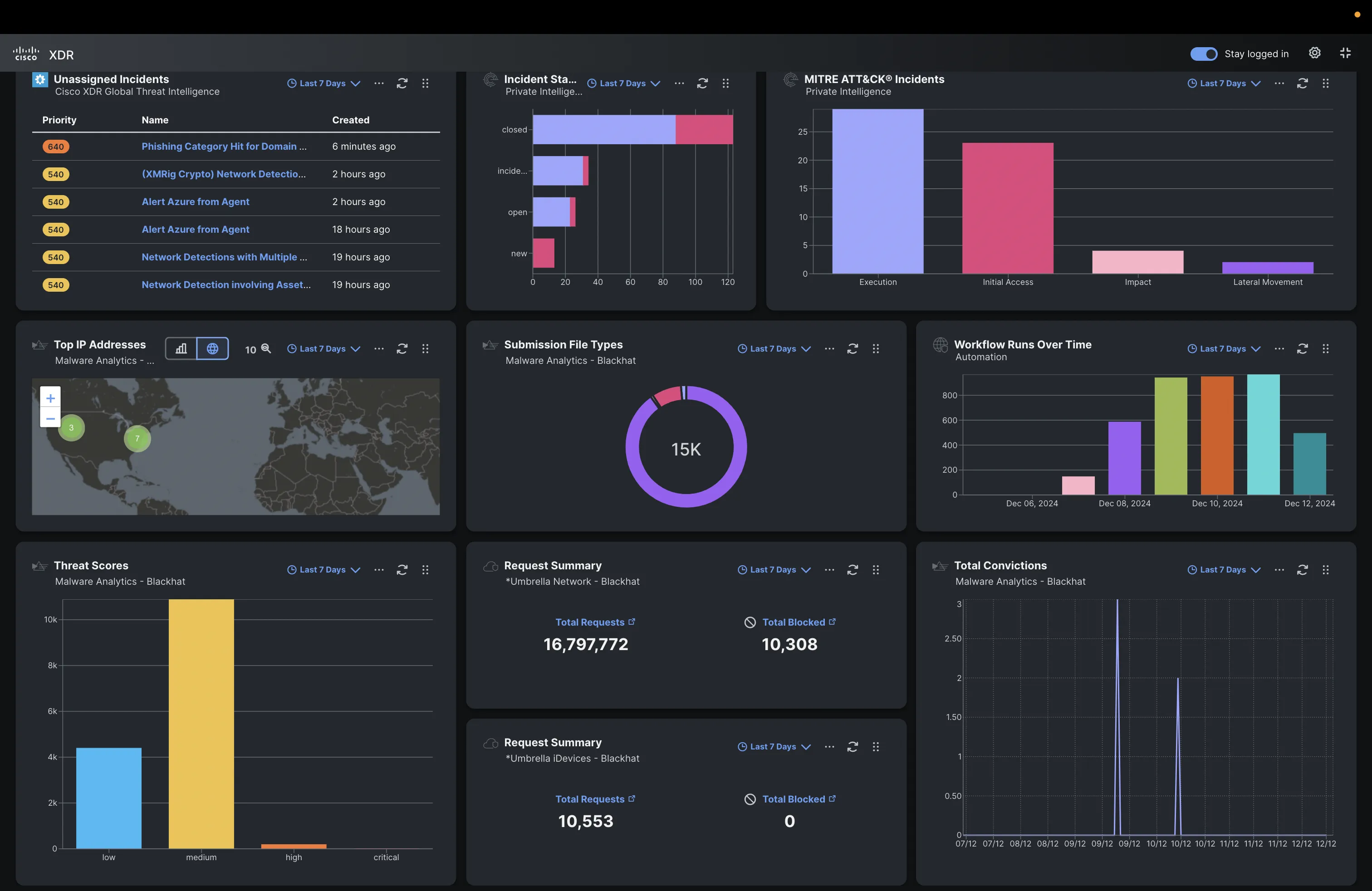 The Cisco XDR Command Center dashboard tiles made it easy to see the status of each of the connected Cisco Secure technologies, and the automation workflows iterations over the week.