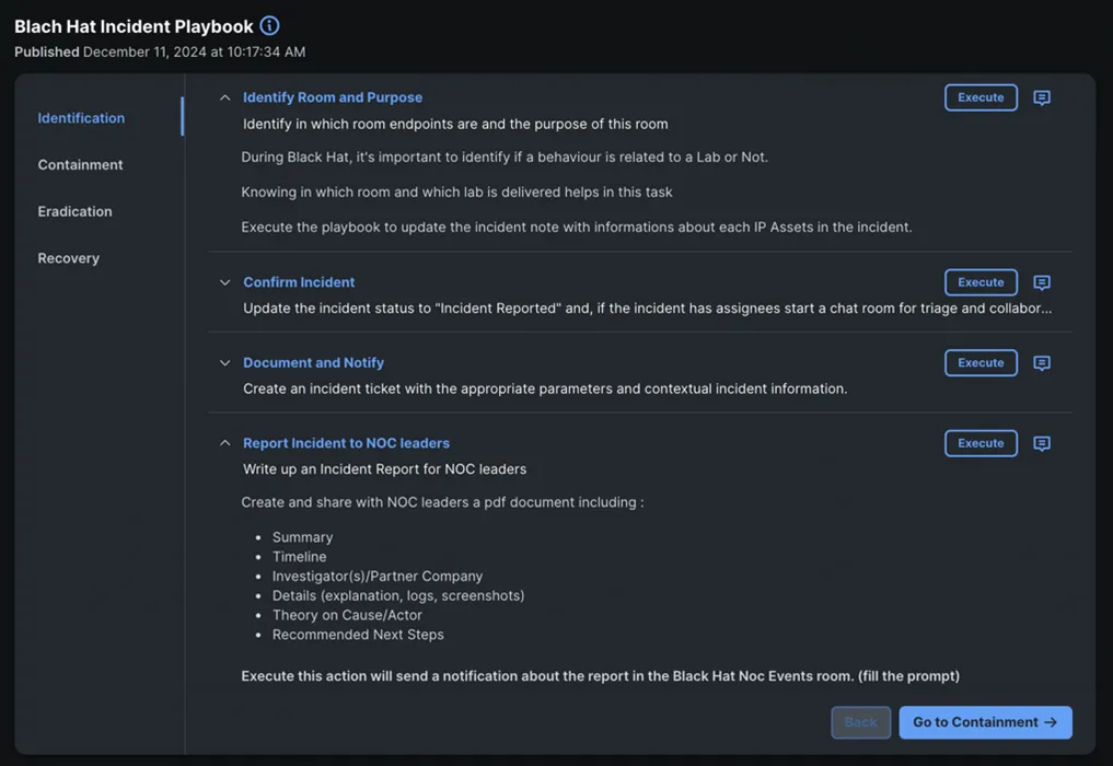 Next question – who is this 10.X.X.X device? And should they be cryptomining at Black Hat? Thanks to another automation workflow, with a click of a action of the Incident Response playbook we had attribution with physical room name and location within the event center from a pre-defined database for the identified asset in the incident. Response