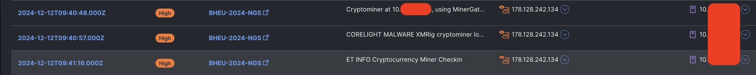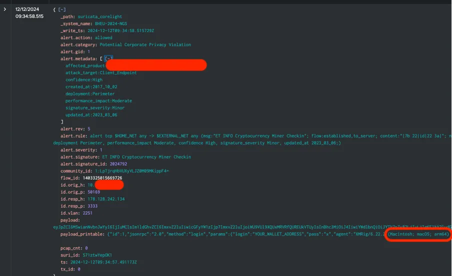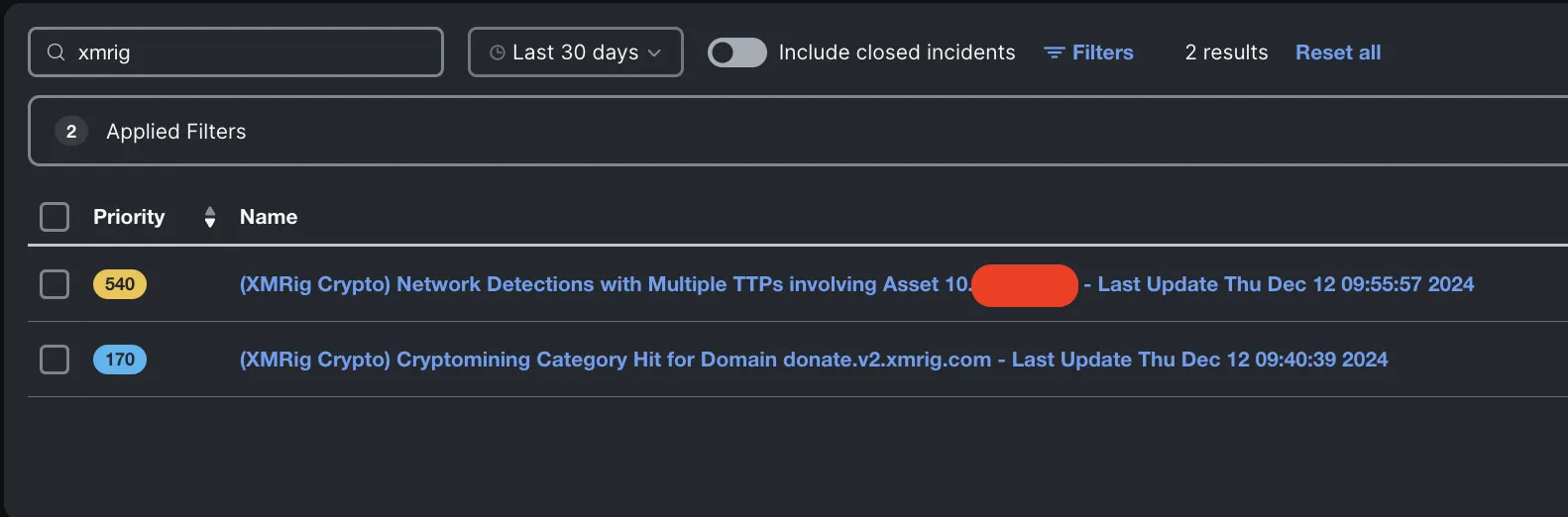 An example of some of these workflows in action together helped us hunt down a potential case of cryptomining in the NOC itself, during the early hours of Dec 12! Thanks to the Corelight and PANW firewalls integrations in XDR, we had ourselves a singular correlated incident, with detections from both partners.