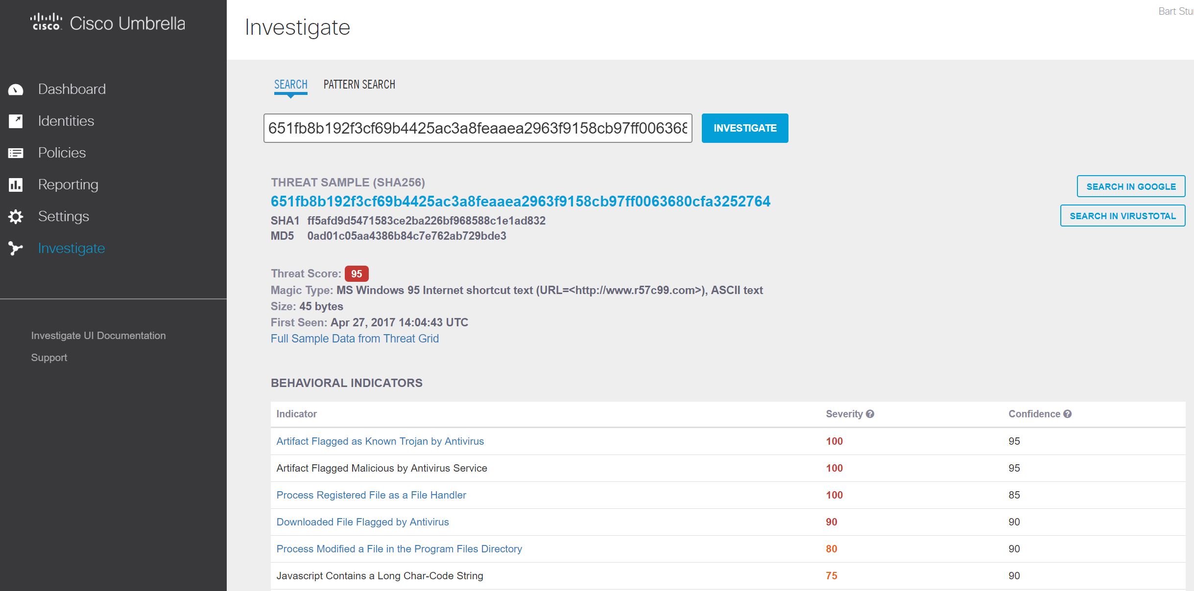 The Threat Grid analysis report gave a summary of the behavioral indicators observed by the sample, with the ability to pivot to the full Threat Grid report that includes integrated threat intelligence, the ability to download the report, download the sample and interact with the sample in the ‘Glovebox’ feature.
