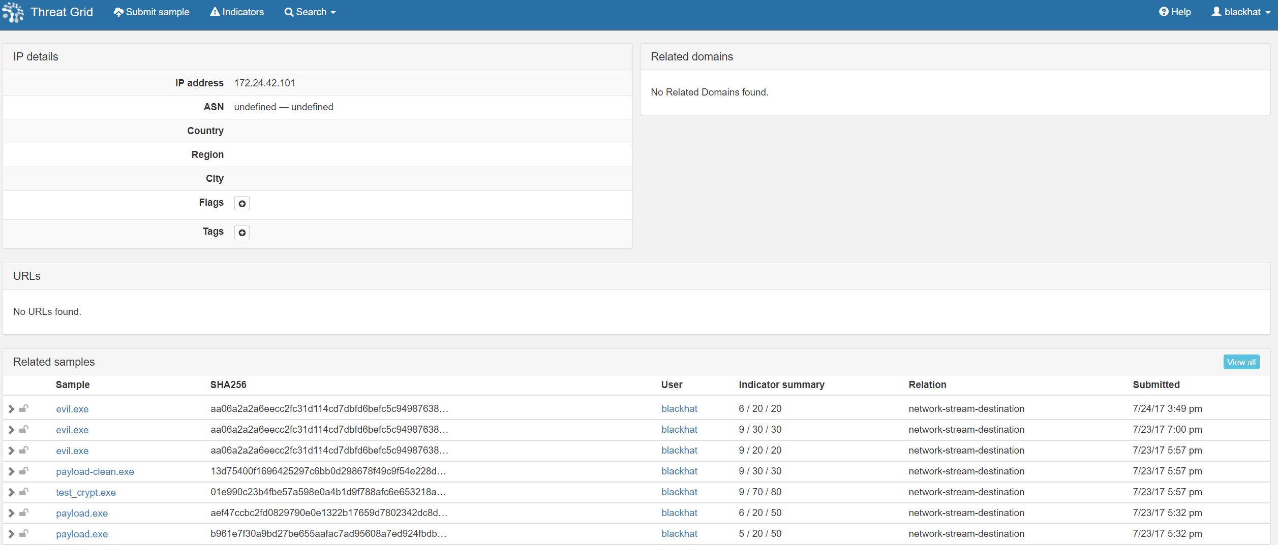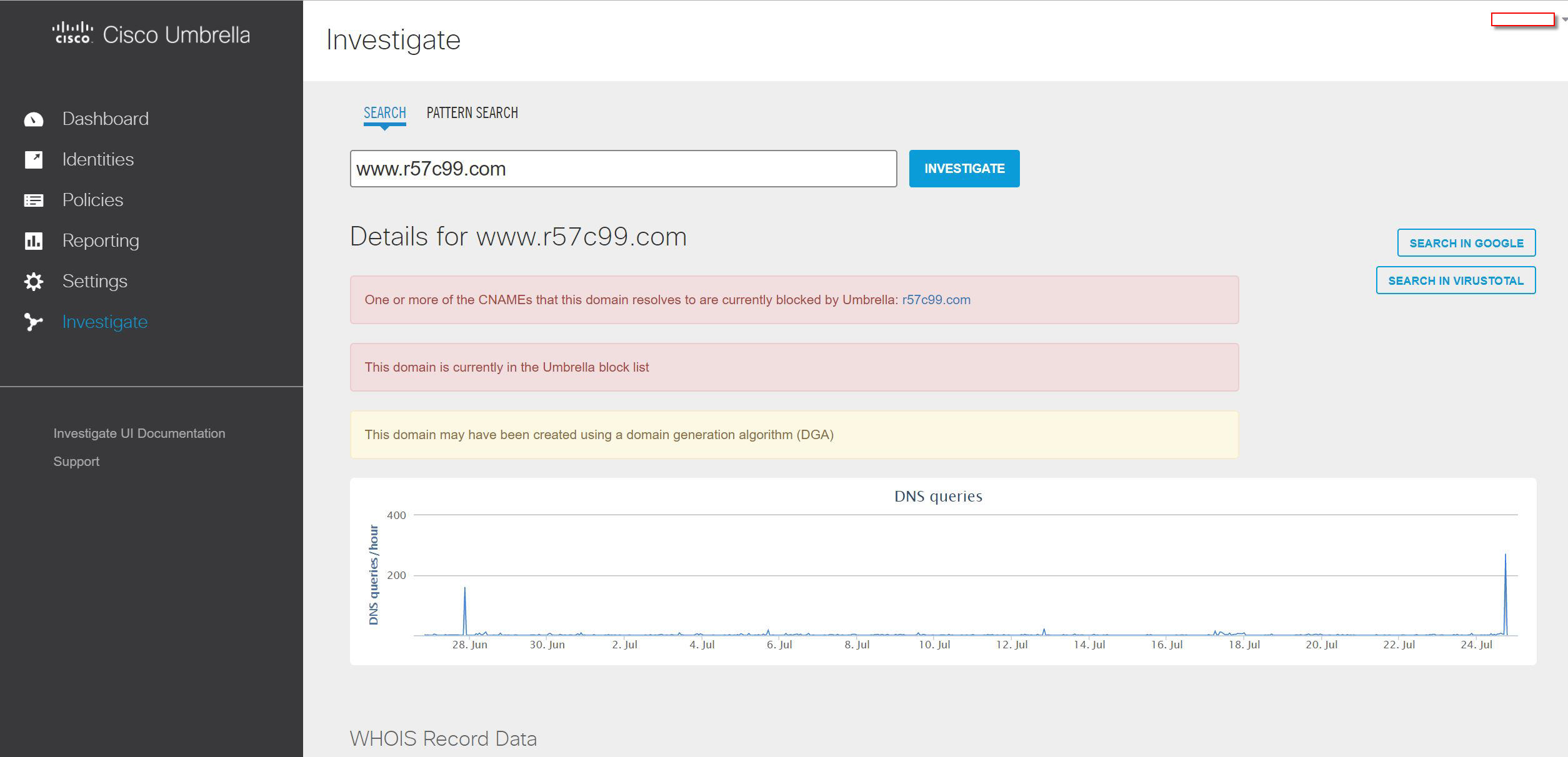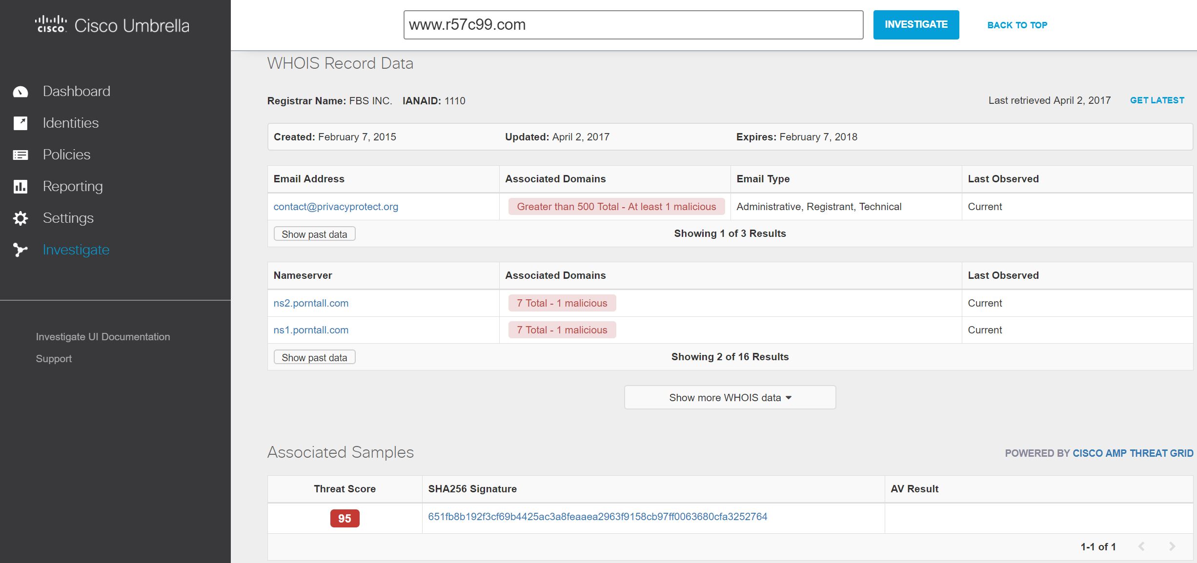 This included global DNS queries, WHOIS information and links to Threat Grid malware analysis reports for samples that have DNS queries to the domain.