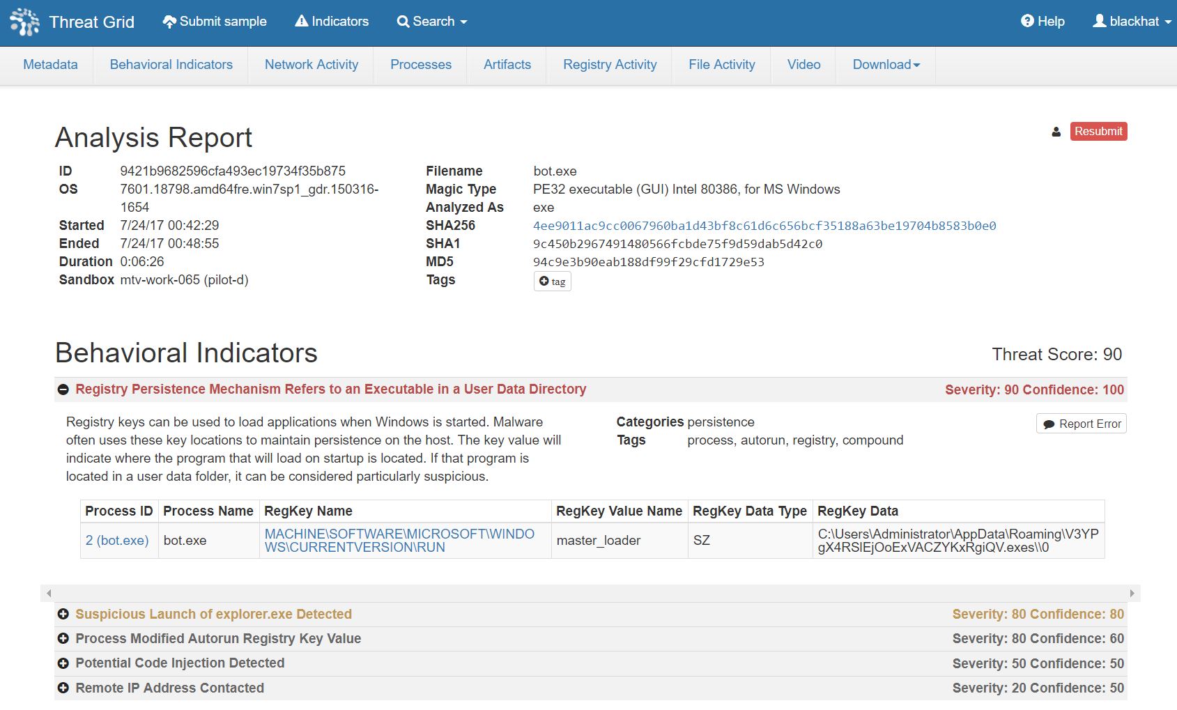 The bot.exe sample had similar behavior, but an elevated Threat Score due to the persistence mechanism in the registry.