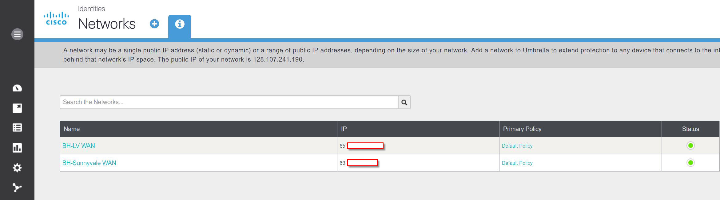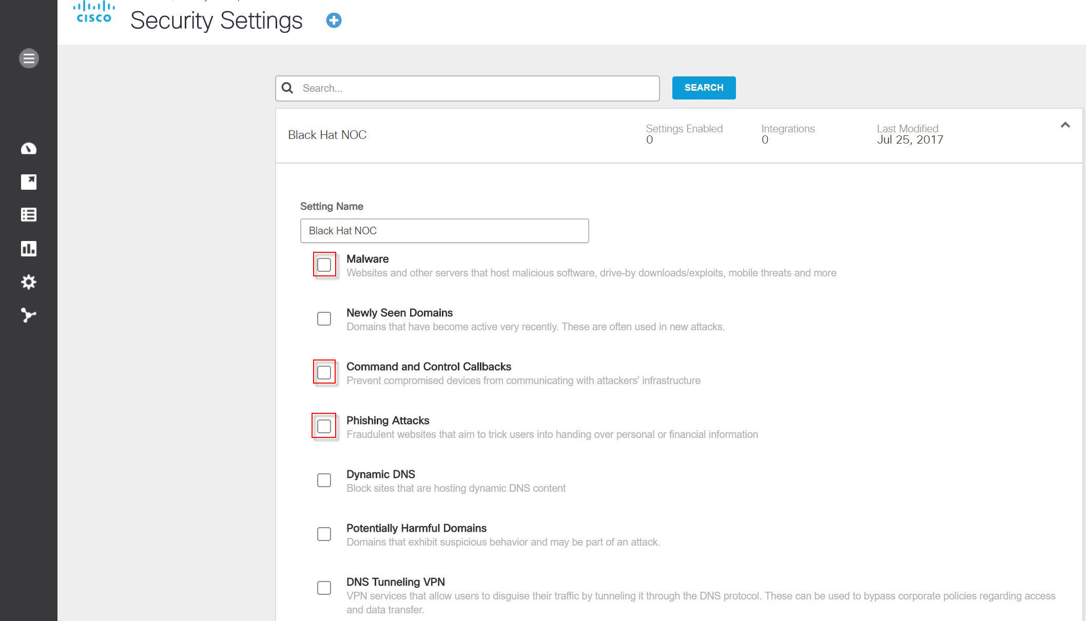 By default, Umbrella will begin blocking DNS traffic to sites known to host Malware, to Command and Control Callback servers and Phishing Attacks. At Black Hat, we wanted to enable all traffic, so the trainers and briefers can show the latest exploits.