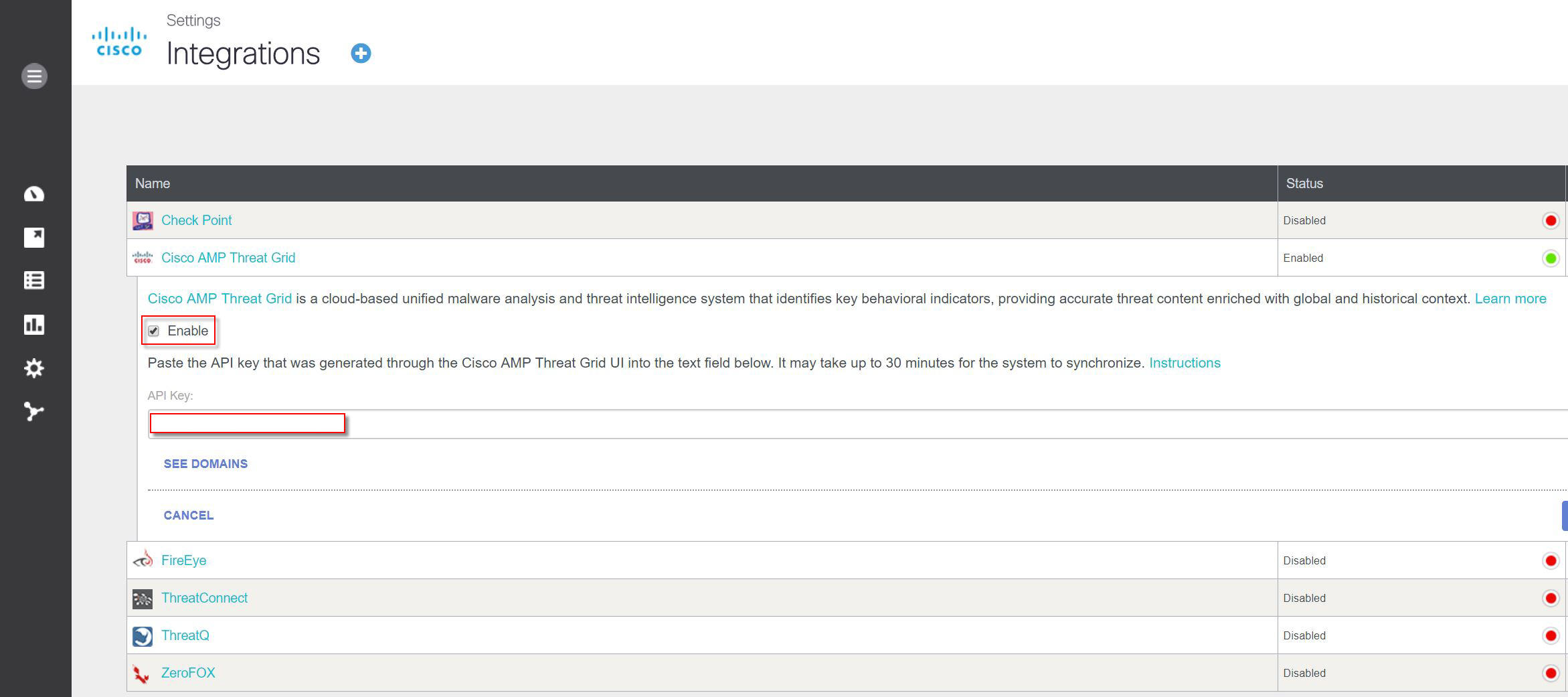 We also enabled the Cisco Threat Grid intelligence feeds integration, by adding in the API key.
