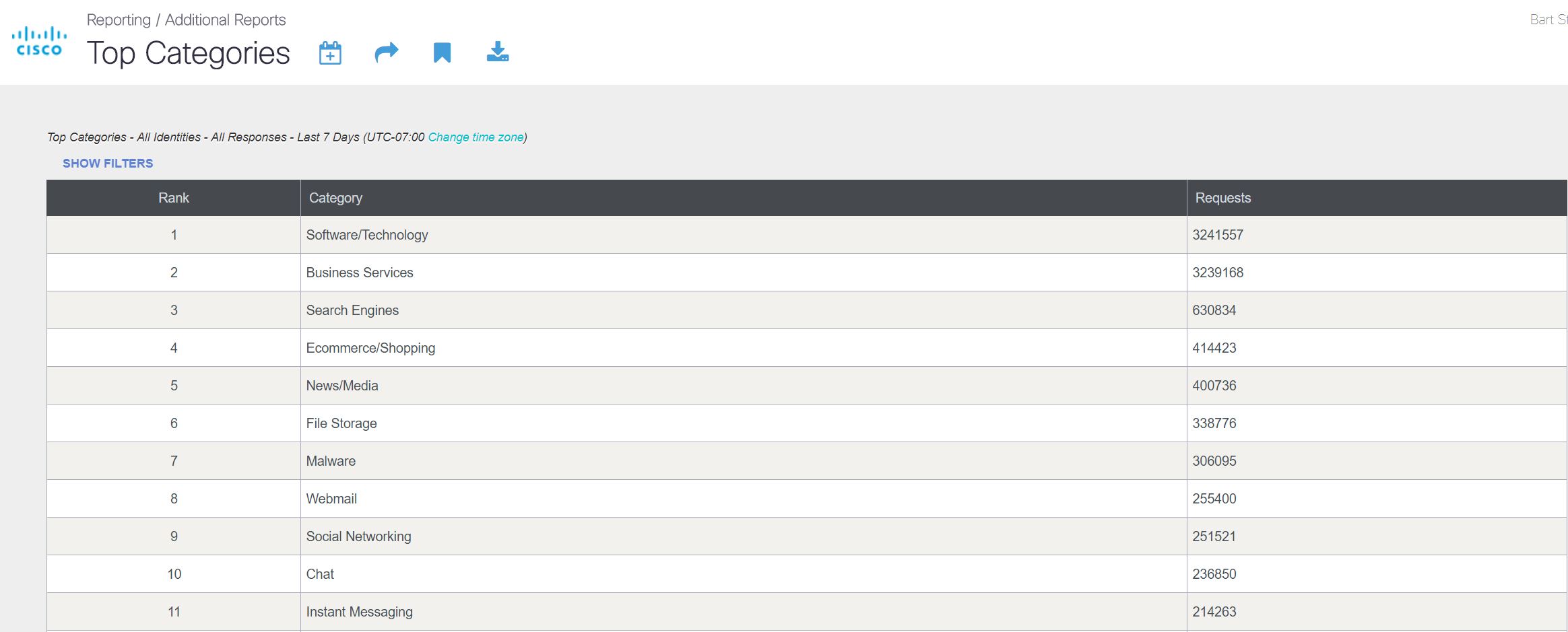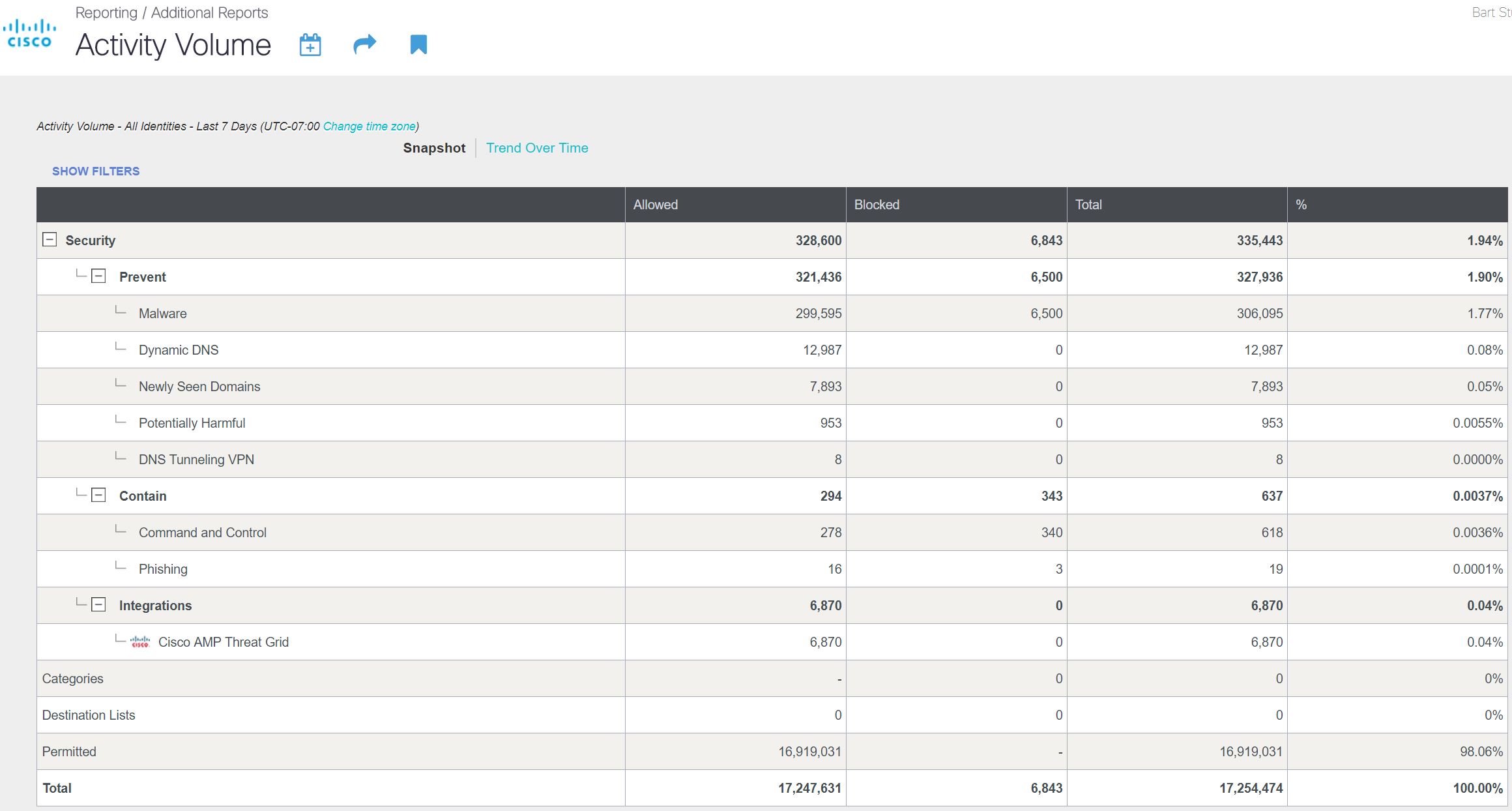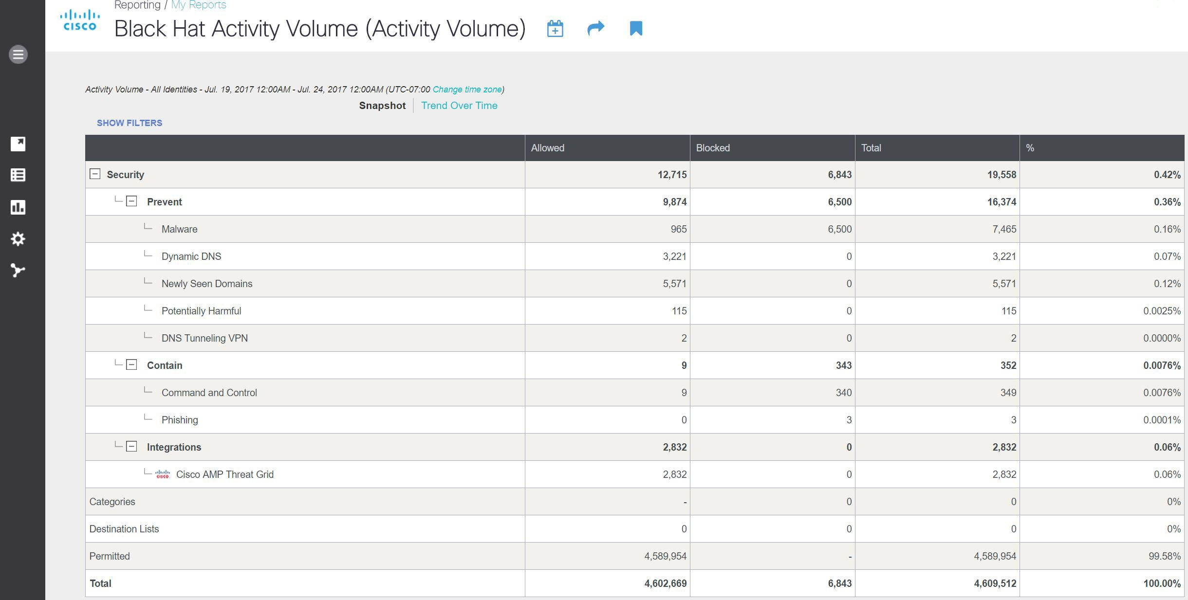 Many presenters set up new domains and simulated malware expressly for the training. Umbrella blocked over 6,800 DNS queries from this default protection, before we turned off the enforcement. Over the weekend, we saw about 4.6 million DNS requests.