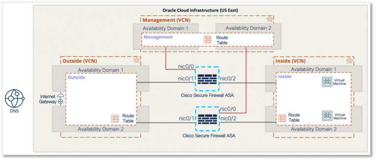 Organizations can deploy Cisco Secure Firewall Threat Defense Virtual (formerly FTDv/NGFWv) and Cisco Secure Firewall ASA Virtual (formerly ASAv) in the OCI environment to enable a secure connection back to the application in the cloud. Traditionally, firewalls scale using clustering but, in the cloud, due to abstraction of layer-2, it is not possible to implement native high-availability and native firewall clustering.