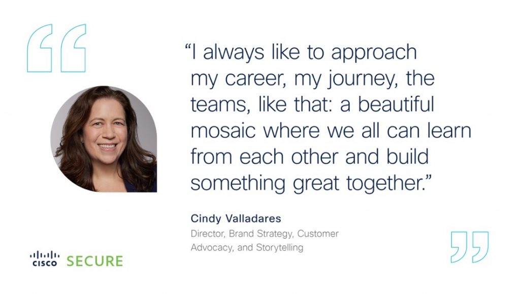 Cindy Valladares: The way I like to explain it to my non-technical family and friends, is that I tell stories. Whether they are stories where our customer is the hero or brand stories that showcase what Cisco does in cybersecurity to make a safer world, we connect with our audience and create experiences for them to see Cisco as a leading cybersecurity vendor.