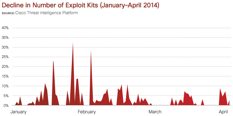 While there’s more competition in the exploit kit market, it’s not translating to a greater number of deployed kits, as Cisco research shows. In fact, the total number of active exploit kits has dropped dramatically—by 87 percent—since Paunch’s arrest.