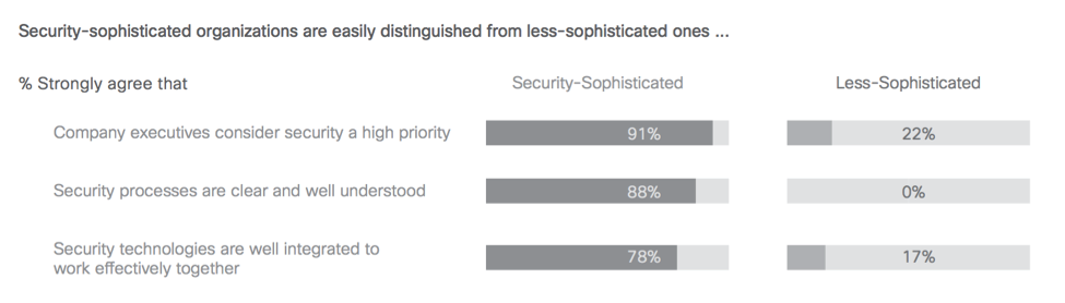 However, just because there’s a leader with a security-related title doesn’t mean that all of an organization’s security problems are solved. The Cisco study found that organizations categorized as having a sophisticated security posture – for example, those that have well-documented policies – are more likely to believe that security is a high priority.