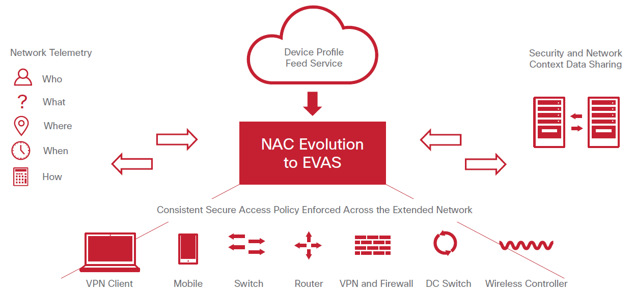 Traditionally, Network Access Control (NAC) has been used to decide who gets access to the network, but was often used for just Guest Access or was just too complicated to implement at all. However, with new IT initiatives like Enterprise Mobility (BYOD), expanding GUEST requirements, and the need to secure a new class of connected devices, the Internet of Things (IoT), the attack surface for cyber threats has increased significantly. NAC has evolved into a technology that has become a critical component in the defense against cyber intrusions and data theft. While Cisco still uses the term “NAC” to describe our offerings since it is the most identifiable term, Enterprise Security Group—a well-known analyst research company—has coined the term endpoint visibility, access, and security (EVAS) to characterize the evolution of NAC.