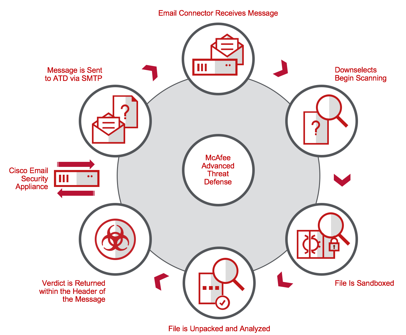 interoperability of Cisco Email Security with the McAfee® Advanced Threat Defense (ATD) solution. This presents a great opportunity for McAfee customers to review their current email defense strategy, and investigate how deploying Cisco’s Email Security Appliance (ESA) with McAfee’s ATD can deliver better protections for this dangerous threat vector. This gives our joint customers a closed-loop email security solution that quickly picks-off unsafe attachments before they get to the end-user.