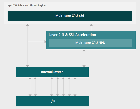 The design employs Intel multi-core CPUs for Layer 7 threat inspections (app visibility, intrusion detection, URL filtering, malware and file inspection, user identity, etc.) and a combination of merchant and a Network Processing Unit (NPU) for layer 2-4 traffic (stateful firewall, NAT, VPN-SSL encryption/decryption, and more.).