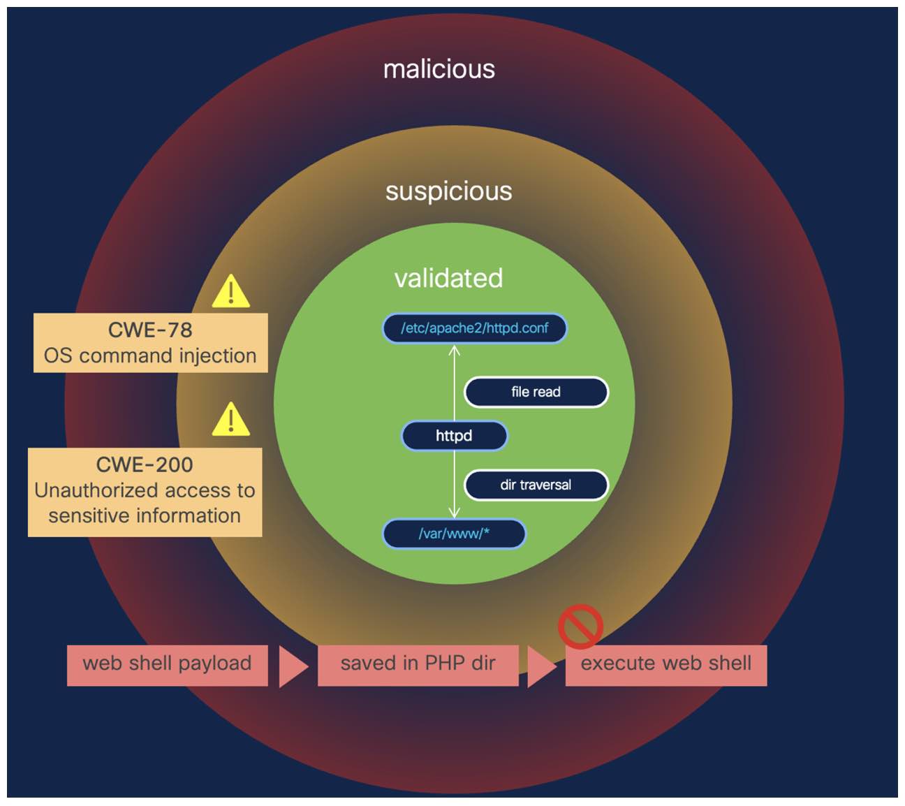 In this scenario, writing to the PHP directory (step b) rapidly reclassifies the behavior from suspicious to malicious due to the context and sequence of actions.