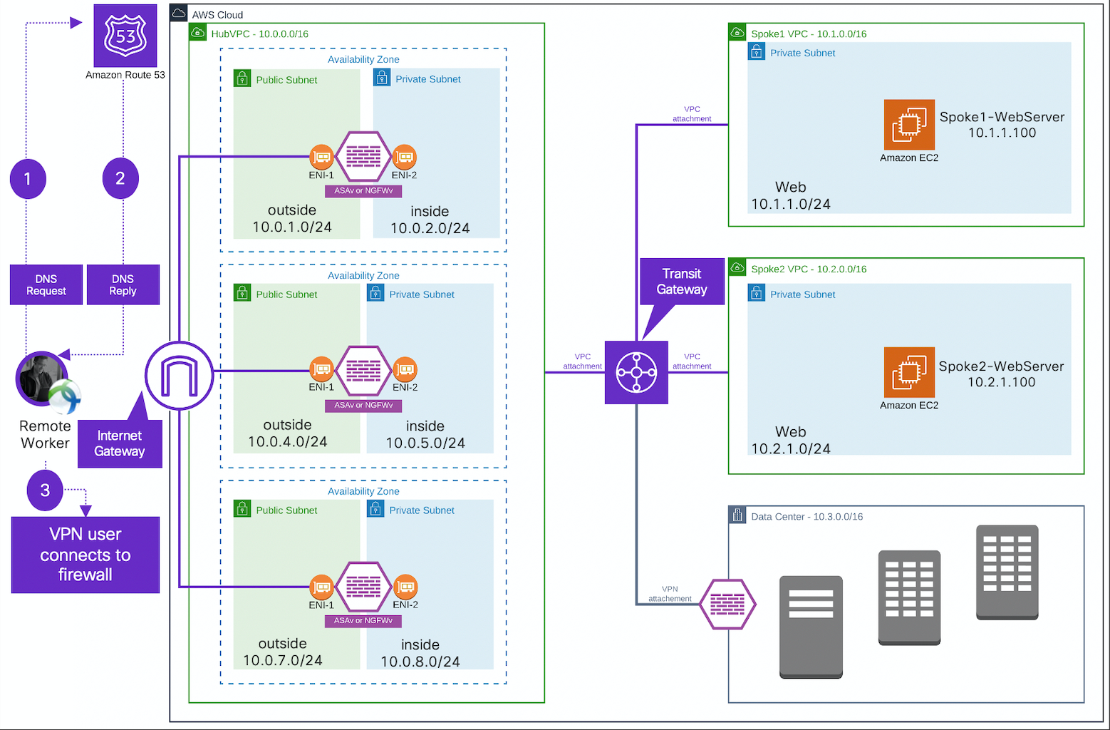 - The remote access VPN user initiates a VPN connection using a hostname (example: answamivpn.com), and the DNS server returns an IP address. AWS route53 monitors all the firewalls using AWS route53 health checks.