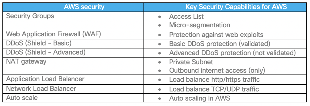 In addition to the above Cisco security control, Cisco recommends using the following native AWS security components to protect workloads and applications.