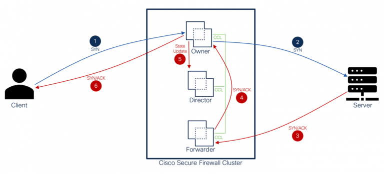 The above diagram explains traffic flow between the client and the server with the insertion of the firewall cluster in the network. Below defines the roles of clustering and how packet flow interacts at each step.