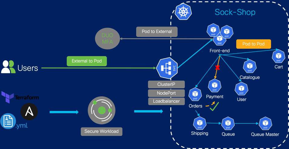 As the graphic below illustrates, Secure Workload ingests policies using Terraform or Ansible, which are widely adopted tools used by the DevOps team to automate infrastructure related tasks. Secure Workload integrates with the CI/CD toolchains using a YAML (.yml) manifest to ingest the policy. It then programs the same policies to the relevant enforcement point to achieve least privilege access for the newly built or upgraded application.