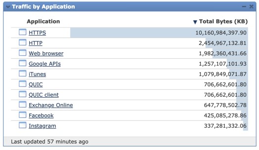The growth in encrypted traffic is interesting and continues a trend we’ve been seeing over the past several years. Digging deeper we can see that HTTPS is by far the most prevalent application on the network. The char below, Traffic by Application, is also potentially misleading as some of the listed applications (ex. Facebook) are in fact communicating over HTTPS.
