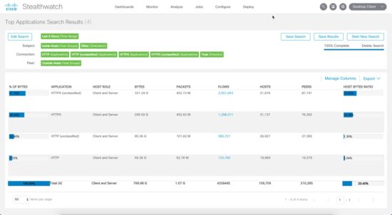 Digging deeper in Stealthwatch we can actually see that there is approximately a 85%:15% ratio of HTTPS:HTTP traffic on the show floor today. This ratio is consistent with what we have seen on other conference networks and the percentage of HTTPS is slowly increasing at every event.