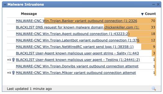 Using DNS services other than those issued by the corporate network is a common methodology in malicious software and flipping over into the FMC we can see that there have been a number of hosts that appear to be infected with various forms of malware, specifically trojans that are reaching outbound.