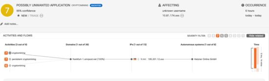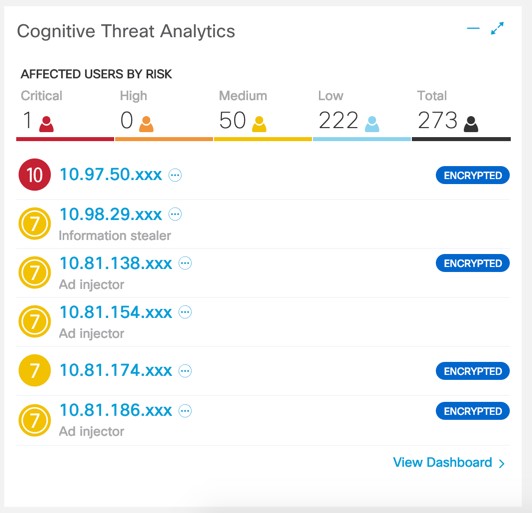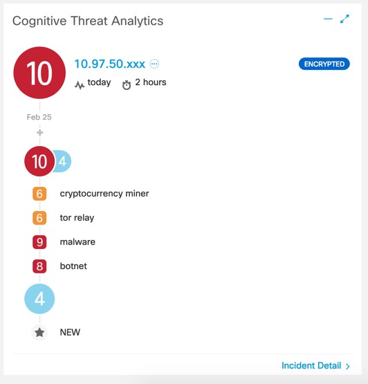 Now let’s take a look at Cognitive Intelligence and what threats it has detected using its multi-layer machine learning engine, inclusive of encrypted traffic analytics. We can see that there were several threats detected and identified in encrypted traffic, a number of these being ad injectors and information stealers. By clicking on one high severity threat we can see that it is indeed a cryptominer, identified using encrypted traffic analytics.