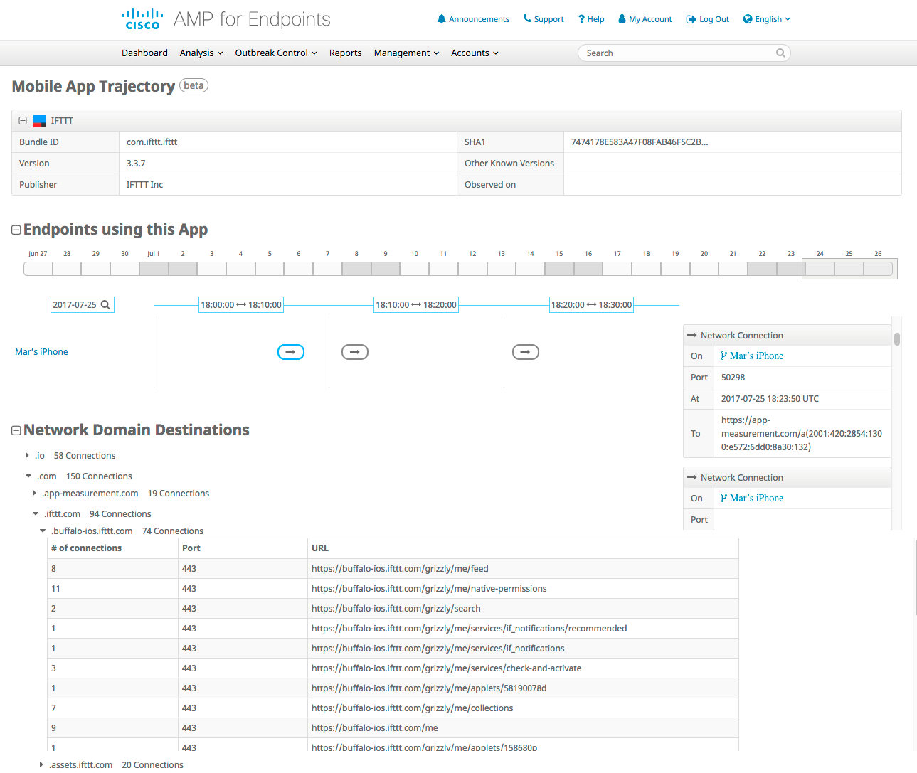 Following a security incident, IT departments must investigate what happened,who it affected, and what the risk is for the company. To do this accurately, they need to build audit reports across users and devices. The Cisco Security Connector gathers all network traffic generated by iOS devices to provide a holistic view of corporate assets, allowing security teams to identify the scope and characteristics of the incident with precision and ease.