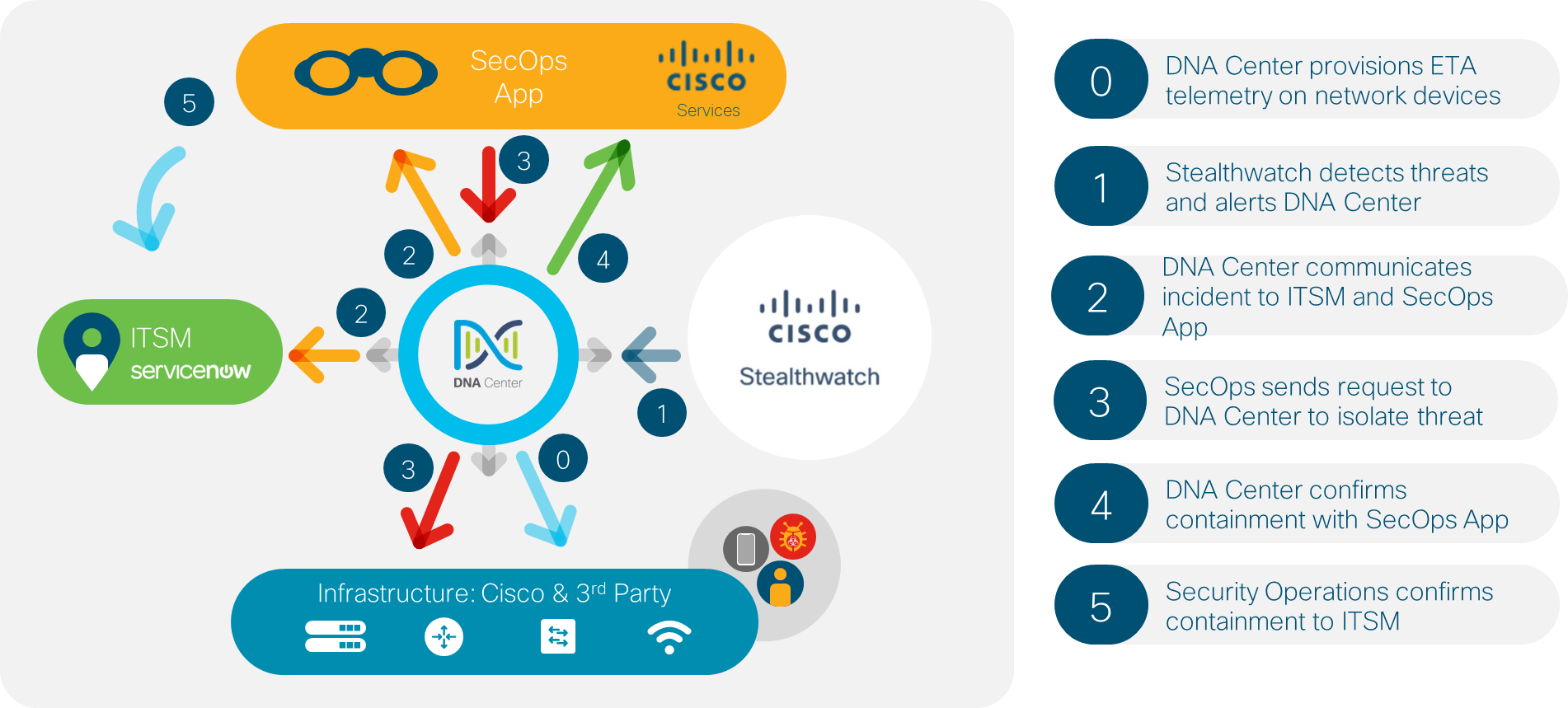Cisco Stealthwatch extends threat detection and containment to the Cisco DNA Center, the one-stop NetOps management for distributed enterprises. Cisco DNA Center now automates enabling threat telemetry, including enhanced telemetry from encrypted traffic (Encrypted Traffic Analytics or ETA), to be sent to Stealthwatch. The critical threats from Stealthwatch, in turn, can now be monitored from the Cisco DNA Center, which provides a platform for custom resolution services such as opening a ticket for automated threat containment.