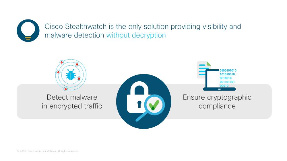 The rapid rise of encrypted traffic is changing the threat landscape. While encryption is great for data privacy and security, it has also become an opportunity for cyber criminals to conceal malware and evade detection. It isn’t feasible to decrypt and analyze encrypted traffic, and with the emergence of TLS 1.3, it won’t even be possible. Cisco has introduced a revolutionary technology, Encrypted Traffic Analytics (ETA), that is enabled by the next-generation Cisco network and Stealthwatch, to analyze encrypted traffic without any decryption. This allows organizations to detect threats in encrypted traffic, and perform cryptographic compliance to know how much of their digital business uses strong encryption and to audit for policy violations.