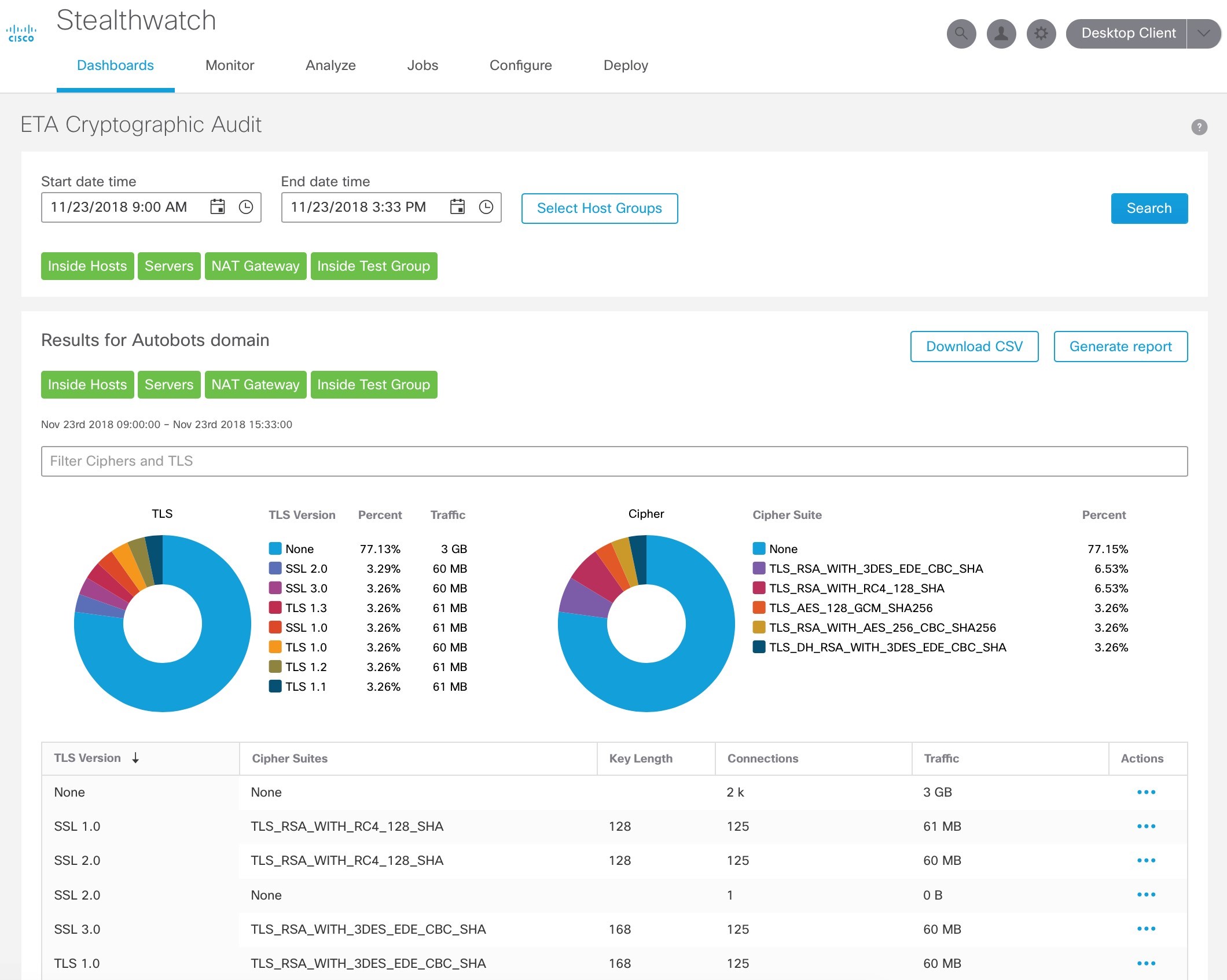 Our latest version of Stealthwatch includes new apps, one of which allows you to easily audit your network for cryptographic compliance. This app helps to analyze encrypted traffic for cryptographic compliance, using the Encrypted Traffic Analytics (ETA) technology. It provides an assessment of the “quality” of encryption being used, which is helpful to audit cryptographic compliance, for example, using SSL or early TLS violates PCI compliance. It also helps to understand trends and changes in the amount and type of encryption.