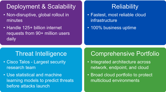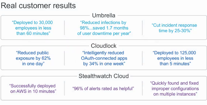 Through Cisco’s differentiated cloud security approach, some captured below, our customers today are reaping the benefits and driving growth and innovation in their own organizations.