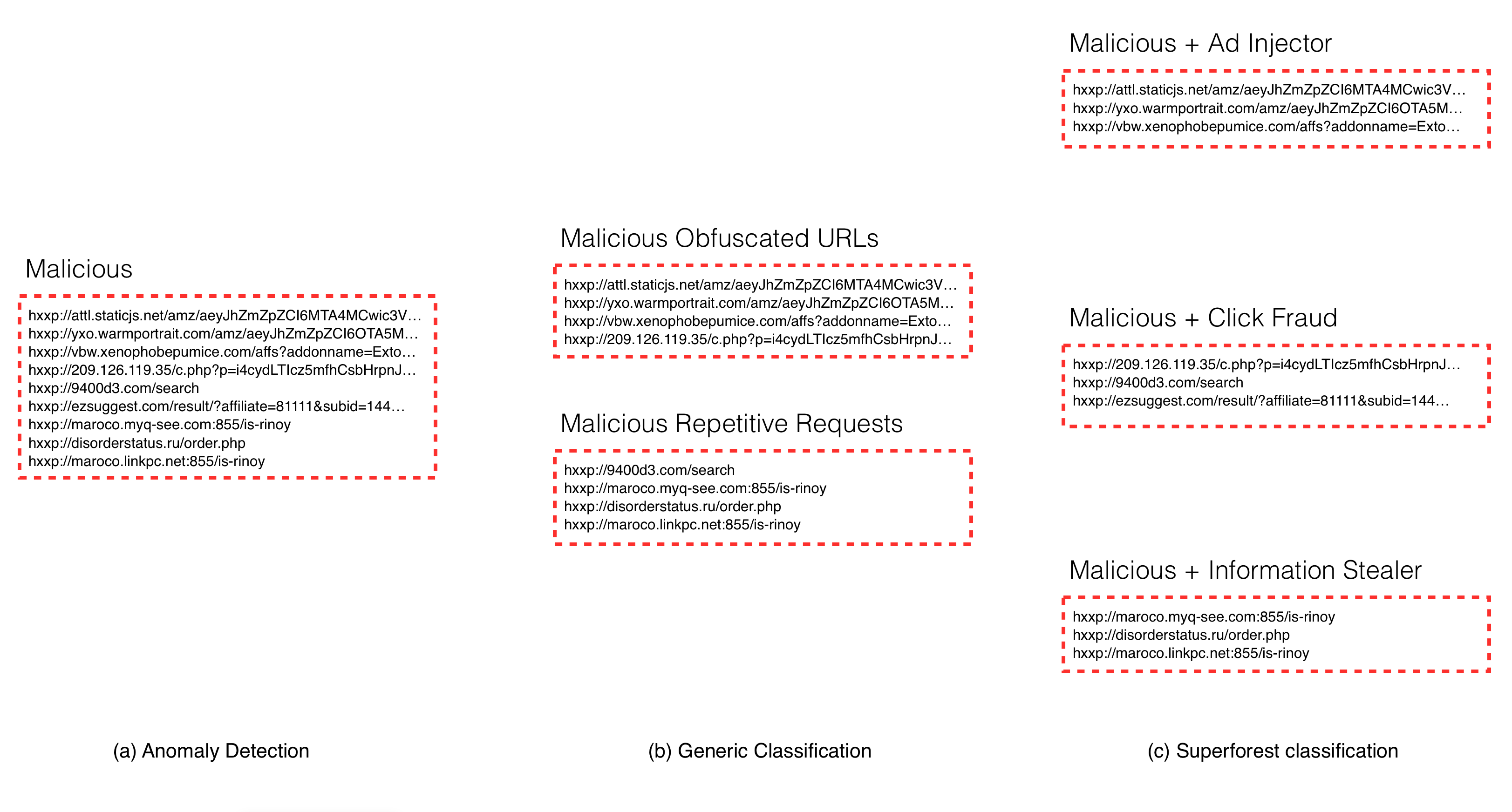 Figure 5: The anomaly detection layer is able to distinguish benign from legitimate (a). Normal classifiers can go further and group malicious behaviors by common characteristics such as the ones depicted in (b). The Superforest classifier is able to provide even more detailed information of each detection (c), which is extremely valuable at the time of prioritizing and remediating threats.