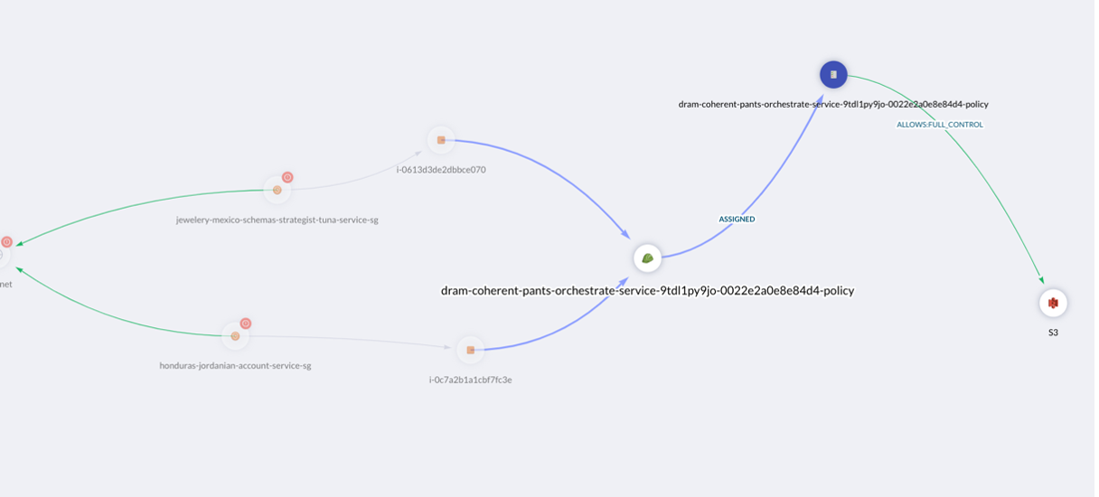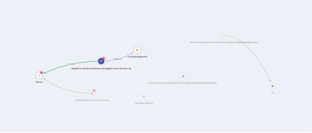This graph not only reveals the connected asset types with various relationships but also expands to disclosing the risk of having the publicly accessible instance compromised, which leads to the exposure of data in the private S3 bucket to leakage or destruction.