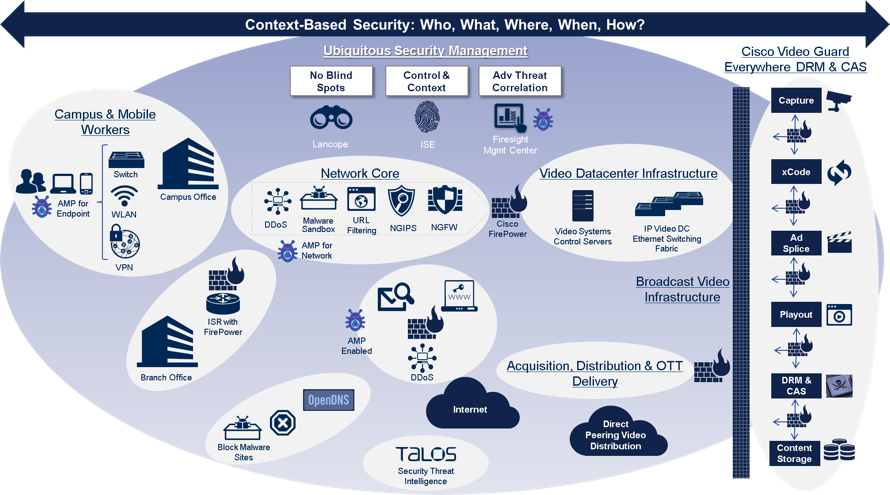 Cisco’s Threat-Centric Security Solutions for the Media Industry are designed to protect your video content and broadcast infrastructure so you can focus on developing compelling content that can be delivered securely to your viewing audience. With Cisco, you are protected by the #1 in data center security and the #1 in video security. Our multilayered solutions work together to ensure that your content, services and business are protected from advanced cyber threats – across the attack continuum – before, during and after an attack. BEFORE the attack, our solution strengthens the network perimeter, enforces secure access, and safeguards media content across networks, systems, users, and data. DURING the attack, it provides real-time detection and mitigation from known threats.  And AFTER the attack, it helps you to quickly discover malware that gets in and resolves these unknown attacks to prevent your business from being compromised.