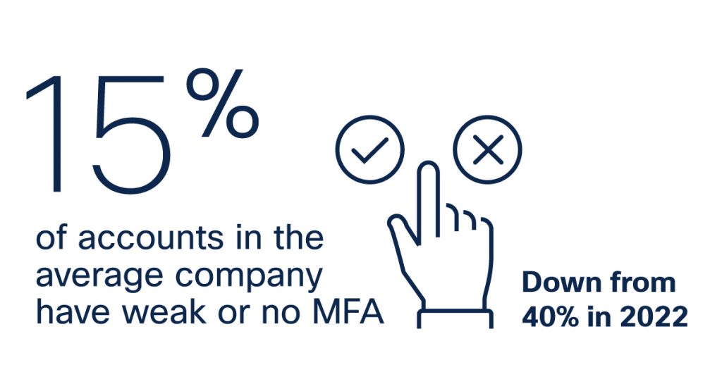 The silver lining is that this appears to be improving. Early last year, in research published by Oort1, now a part of Cisco, found that 40% of accounts in the average company had weak or no MFA in the second half of 2022. Looking at updated telemetry from February 2024, this number has dropped significantly to 15%. The change has a lot to do with wider understanding of identity protection, but also an increase in awareness thanks to an uptick in attacks that have targeted accounts relying on base credentials alone for protection.