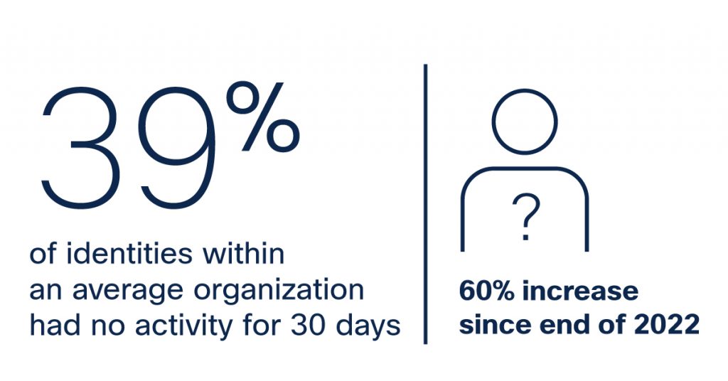 Dormant accounts are an often-overlooked security issue. According to Cisco’s telemetry, 39% of the total identities within the average organization have had no activity within the last 30 days. This is a 60% increase from 2022.