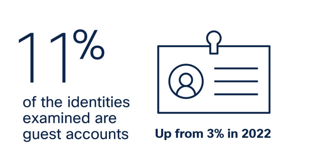 And their use is increasing. In February 2024, almost 11% of identities examined are guest accounts— representing a 233% jump from the 3% reported in 2022. While we can only speculate, it is possible that cloud-adoption and remote work contributed to this rise, as enterprises used temporary accounts to stage new services and applications or enable remote workloads in the short-term. The use of temporary accounts is understandable, but if they’re forgotten or ignored, these shortcuts represent a serious risk.
