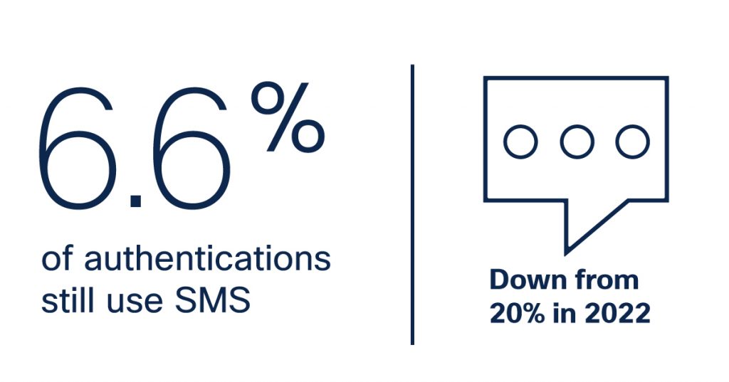 This is backed up by research coming from the 2024 Duo Trusted Access Report, where using SMS texts and phone calls as a second factor has dropped to 4.9% of authentications, compared to 22% in 2022.