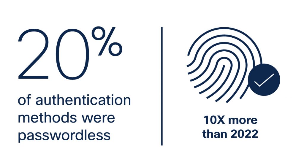 Based on the numbers, passwordless is the new trend. In 2022, phishing resistant authentication methods such as passwordless accounted for less than 2% of logins. However, in 2024, Cisco’s telemetry shows this number is climbing, currently representing 20%, or nearly a 10x increase. This is great news, but still highlights a critical point—80% are still not using strong MFA.