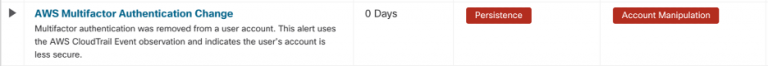 “AWS Mulifactor Authentication Change” alert which can identify disabling MFA.