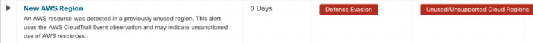 “New AWS Region” alert which can be used to detect defense evasion targeting unused regions.