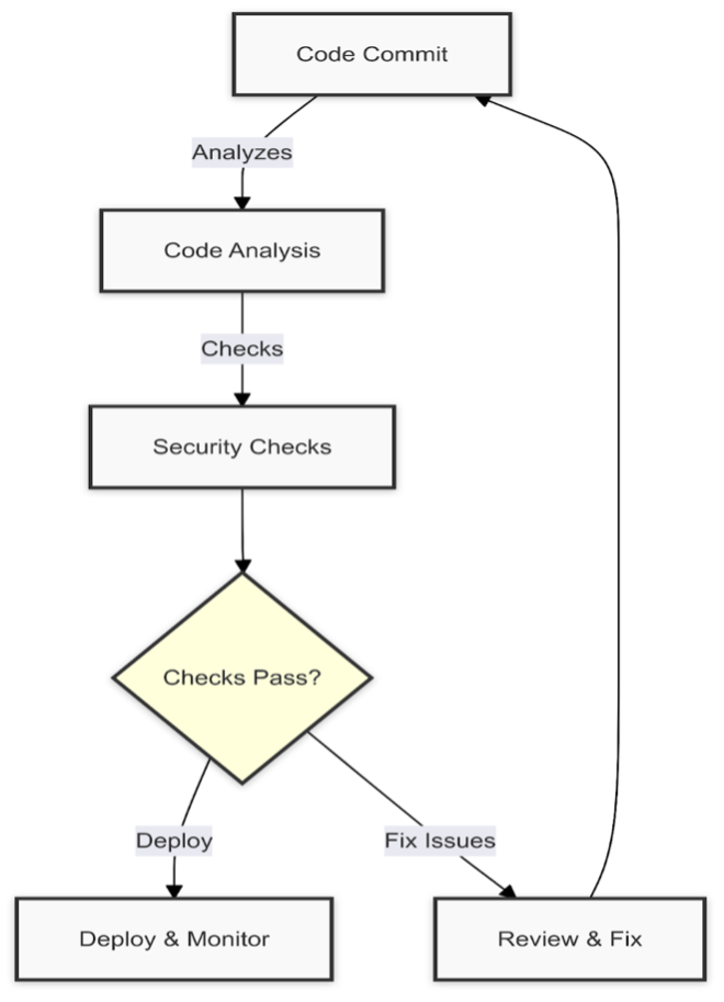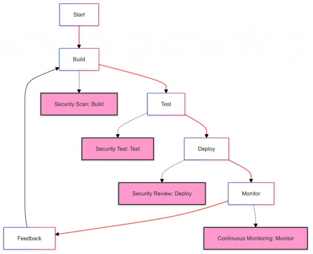 Automated Security Pipeline in DevOps: This cyclical process—from code commitment through security checks to deployment—ensures rapid and secure software delivery.