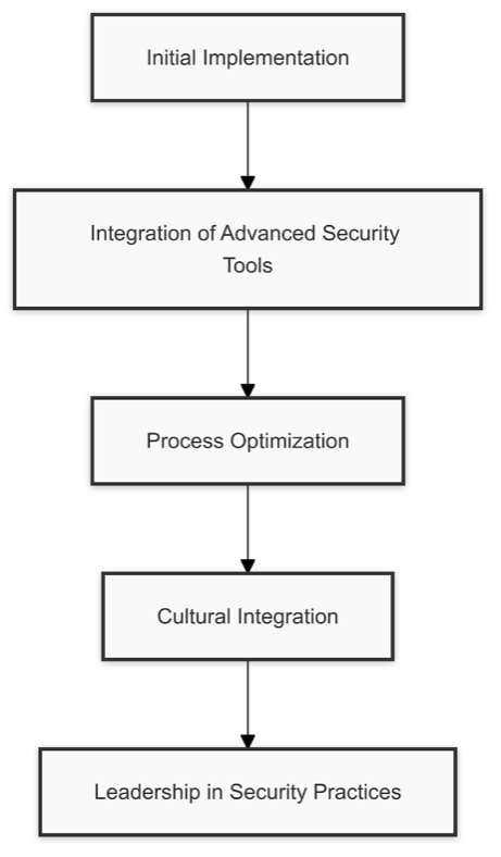 DevOps Security Integration Roadmap: This illustrates the path from initial implementation to advanced security leadership within DevOps practices.