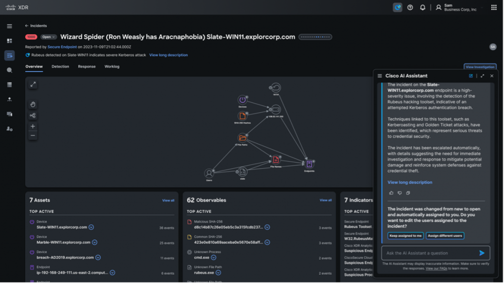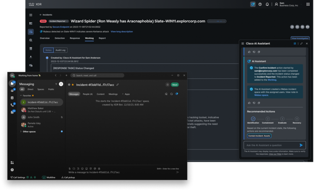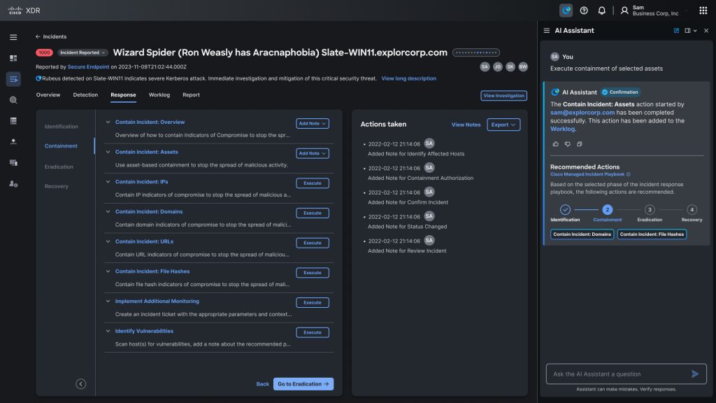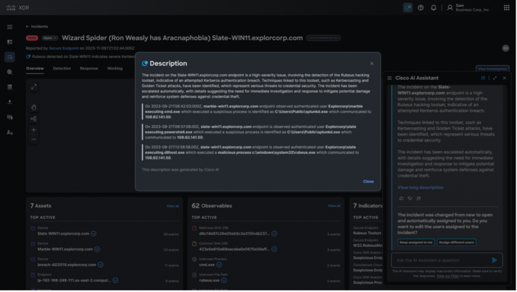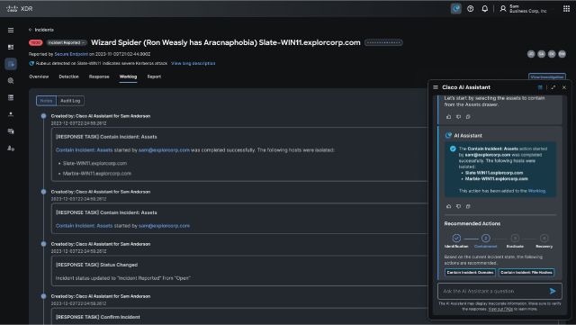Our AI Assistant, powered by Cisco XDR the platform for Cisco’s Breach Protection Suite, synthesizes data from email, web, processes, endpoints, cloud, and network domains, offering precise action recommendations to effectively contain ongoing cyber-attacks. It works at machine scale to identify patterns and potential attacks that humans might miss because of alert fatigue, if a defender is only looking at one domain in isolation, or while trying to manually correlate data. The AI Assistant is context aware, meaning it tracks the state of the incident in real-time and generates tailored recommendations specific to that incident.