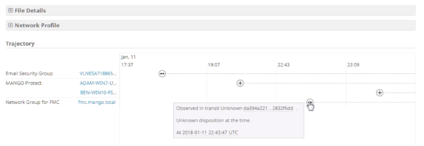 AMP Unity is a capability that allows organizations to register their AMP-enabled devices (Cisco NGFW, NGIPS, ESA, CES, WSA with a Malware/AMP subscription) in the AMP for Endpoints Console. In this way, those devices can be seen and queried (for sample observations) the same way the AMP for Endpoints Console already provides for endpoints. This integration allows correlating file propagation data across all of the threat vectors in a single User Interface (Global File Trajectory view).