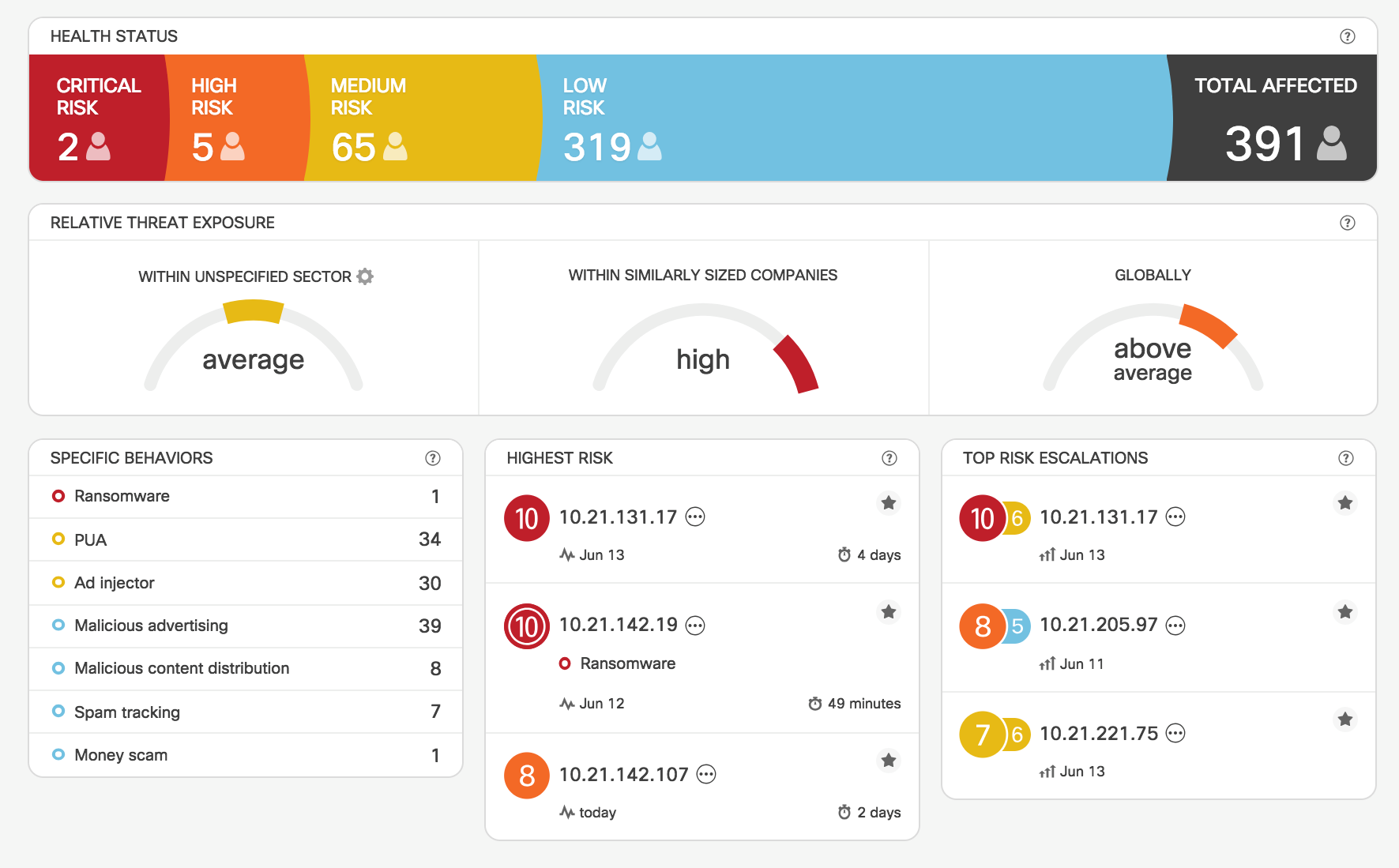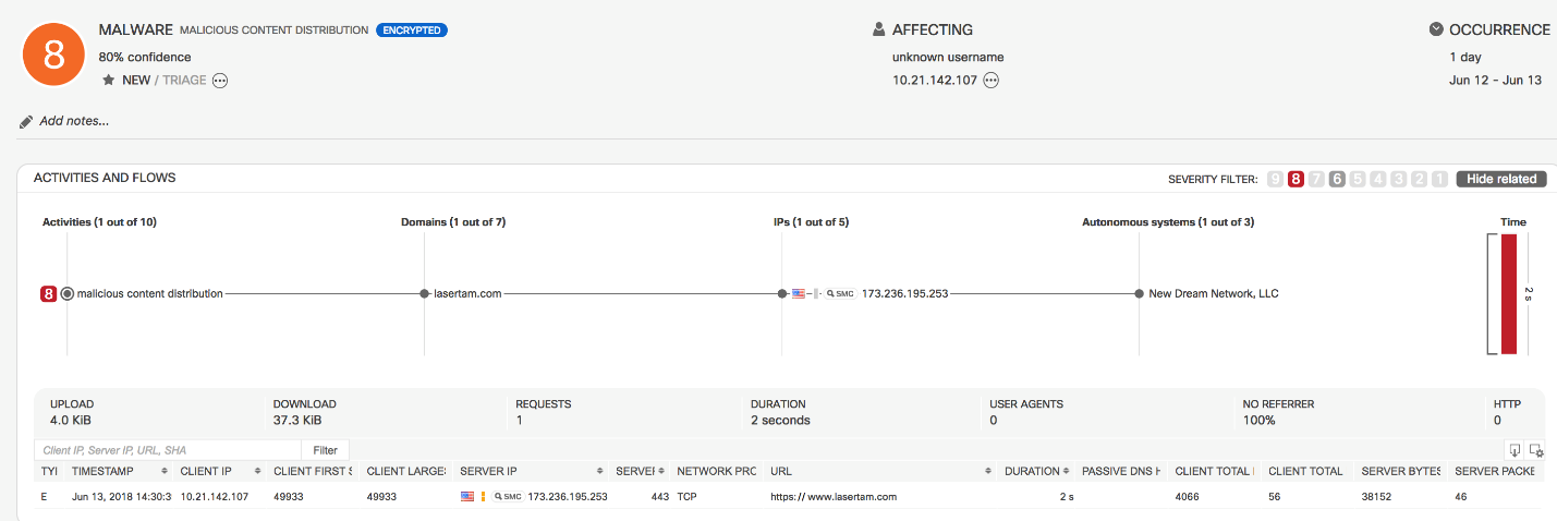 We detected more than 5000 individual security events, including numerous data exfiltration and command-and-control events. Using cloud-based machine learning and global risk maps, Stealthwatch automatically reduced that number to 398 significant security detections, including 7 that ranked as critical- and high-risk detections.