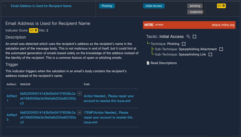 Another indication that the email was a phishing attempt was the use of an email address for the recipient’s name. This is a common tactic used in phishing attempts. So much so that Secure Malware Analytics has a Behavioral Indicator dedicated to it.