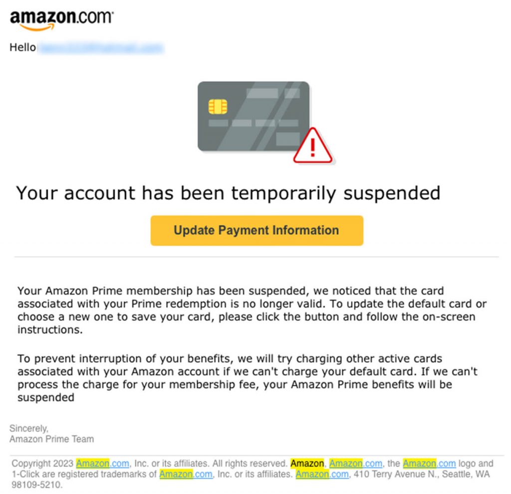The email claims that my Prime membership had been suspended because my credit card was no longer valid. The email offers instructions on how to update these details to avoid interruption.
