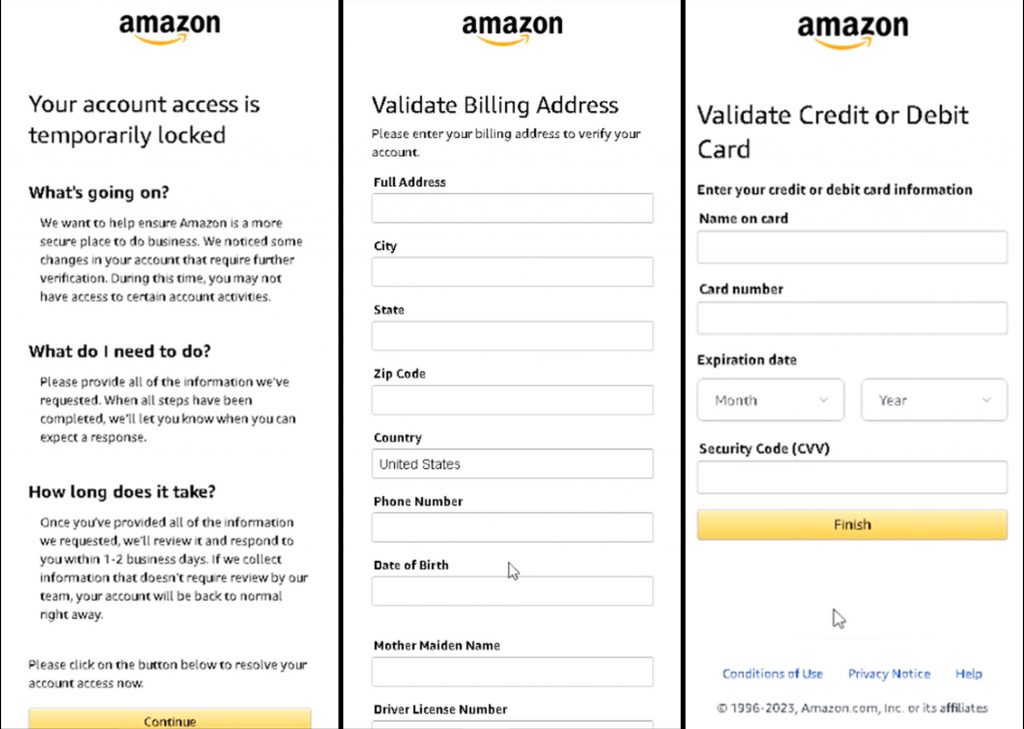 The phishing link takes us to a site that provides a very similar login experience to a real Amazon page. After entering account credentials—email, phone number, password—the site presents a page that claims that there have been changes to the account that require further verification. The site asks you to validate billing and credit card details, alongside less commonly requested details such as your mother’s maiden name and social security number.